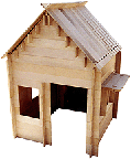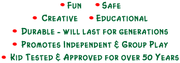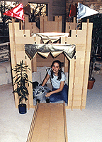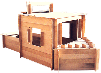 Each Slotwood building set consists of 300 interlocking slotted wood parts varying in length from six inches to four feet, and in widths of two to four inches. The parts fit together easily and securely. Children love Slotwood’s large scale. Unlike small building sets which can only be played with, Slotwood playhouses are large enough to play IN. Slotwood is safe. No tools are needed. There are no sharp edges or metal parts. |